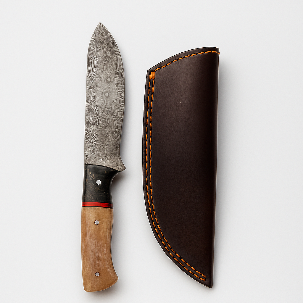 Elevate your outdoor gear with this Hand-Forged Damascus Steel Skinner Knife, crafted for precision, durability, and timeless style. Featuring a full tang blade made with over 1,000+ layers of 1095 & 15N20 Damascus steel, this knife is quenched and tempered to 57-58 HRC hardness for long-lasting edge retention.