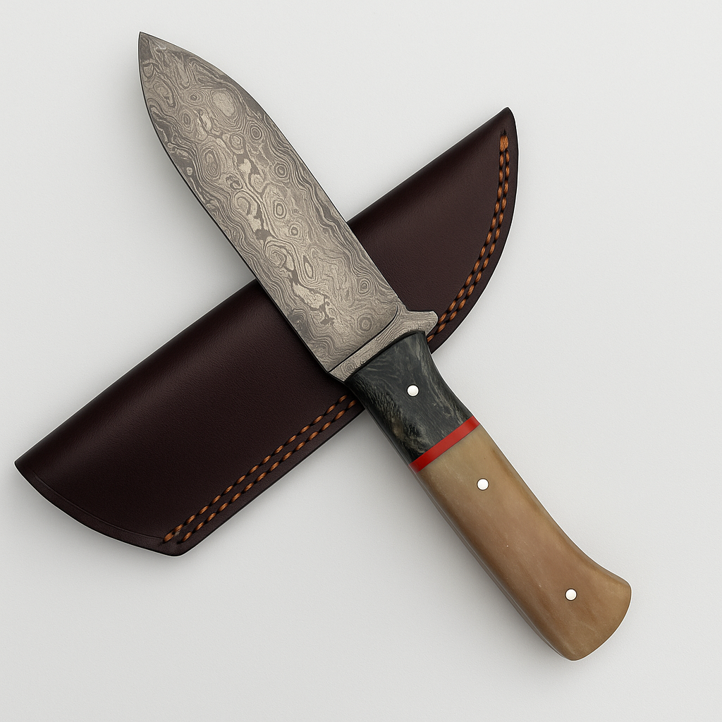 Hand-Forged Damascus Steel Skinner Knife – Bone Handle with Leather Sheath