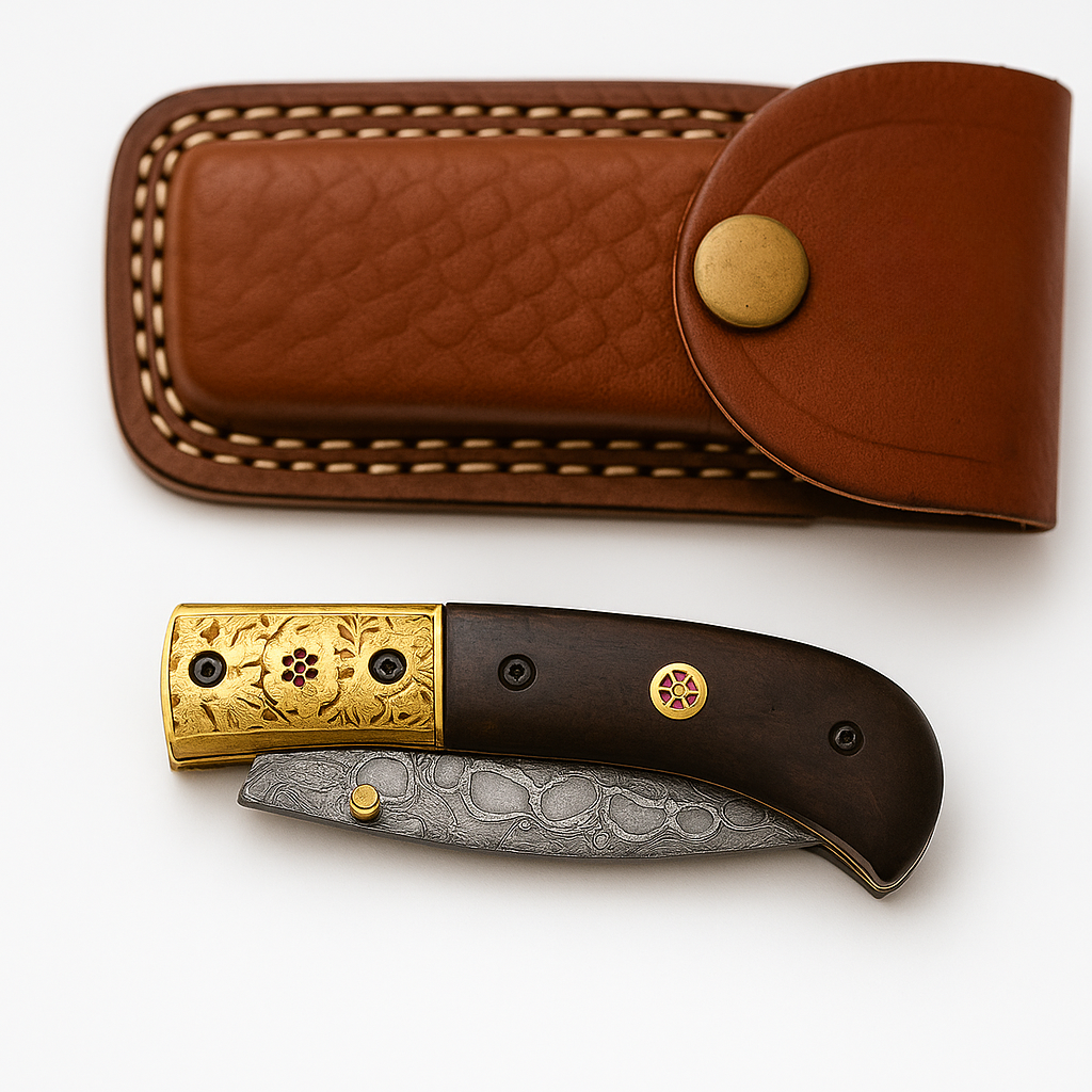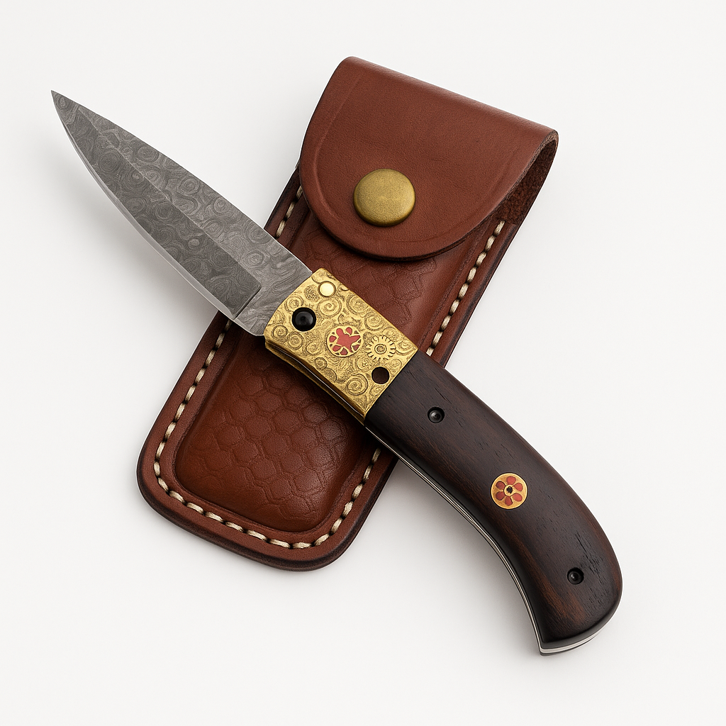 Perfect as an EDC pocket knife, this folding blade combines practicality with timeless style. Comes with a hand-stitched leather sheath for safe carrying and storage.