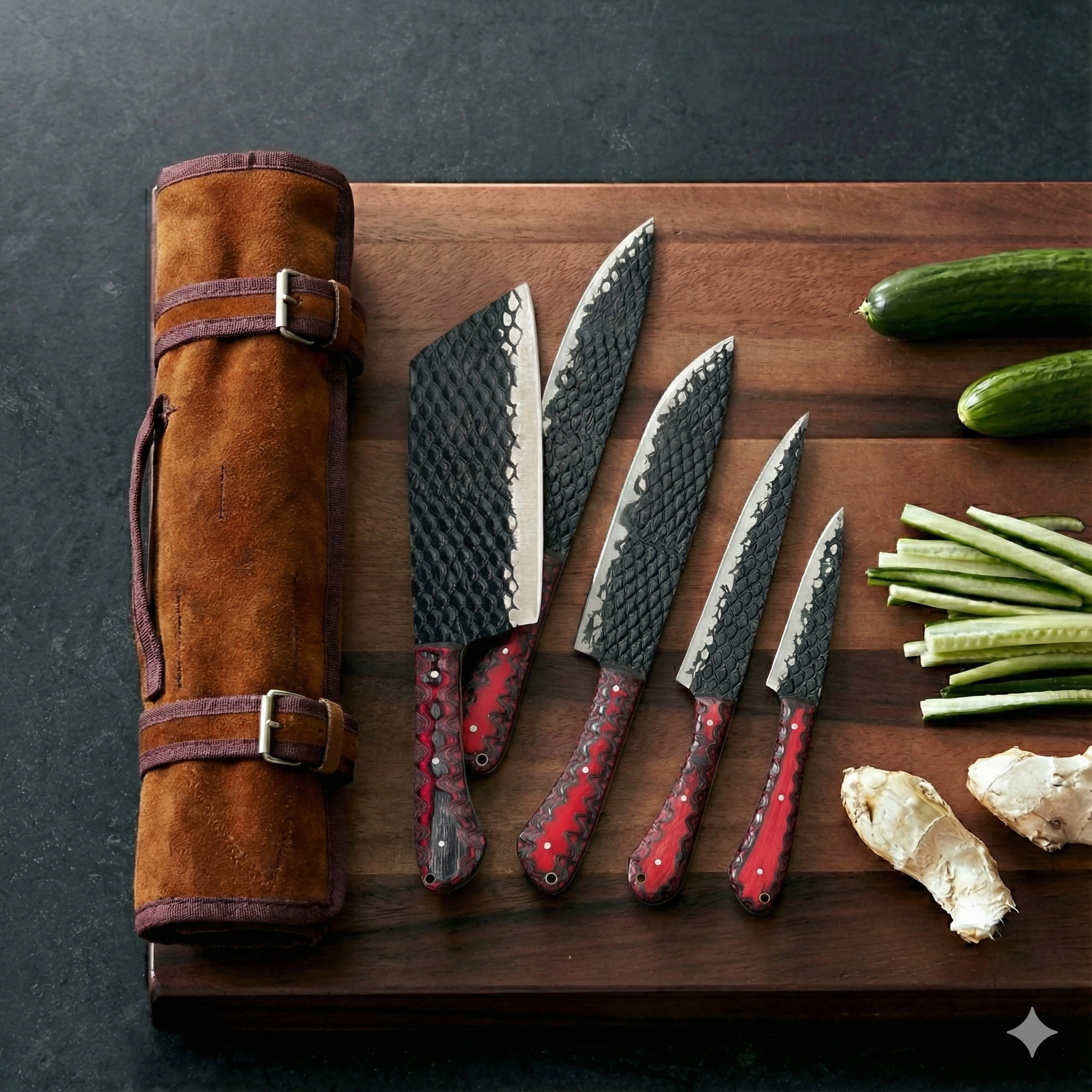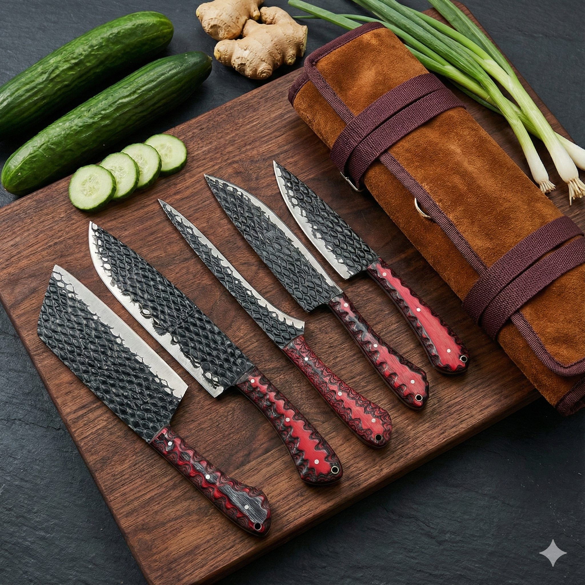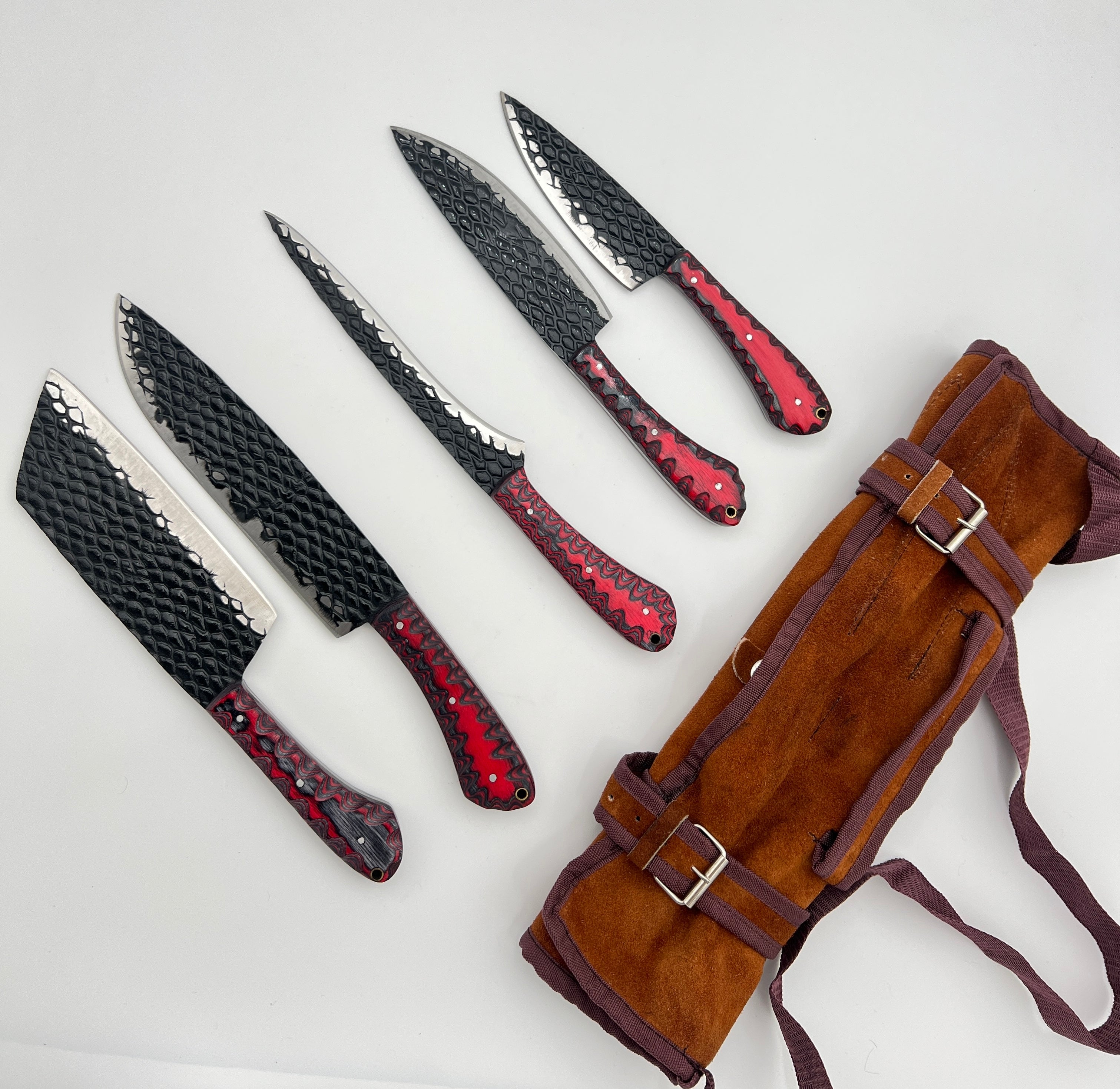 5-Piece "Dragon Scale" Hand-Forged Kitchen Knife Set — Black Textured Blade & Red/Black Scalloped Wood Handles