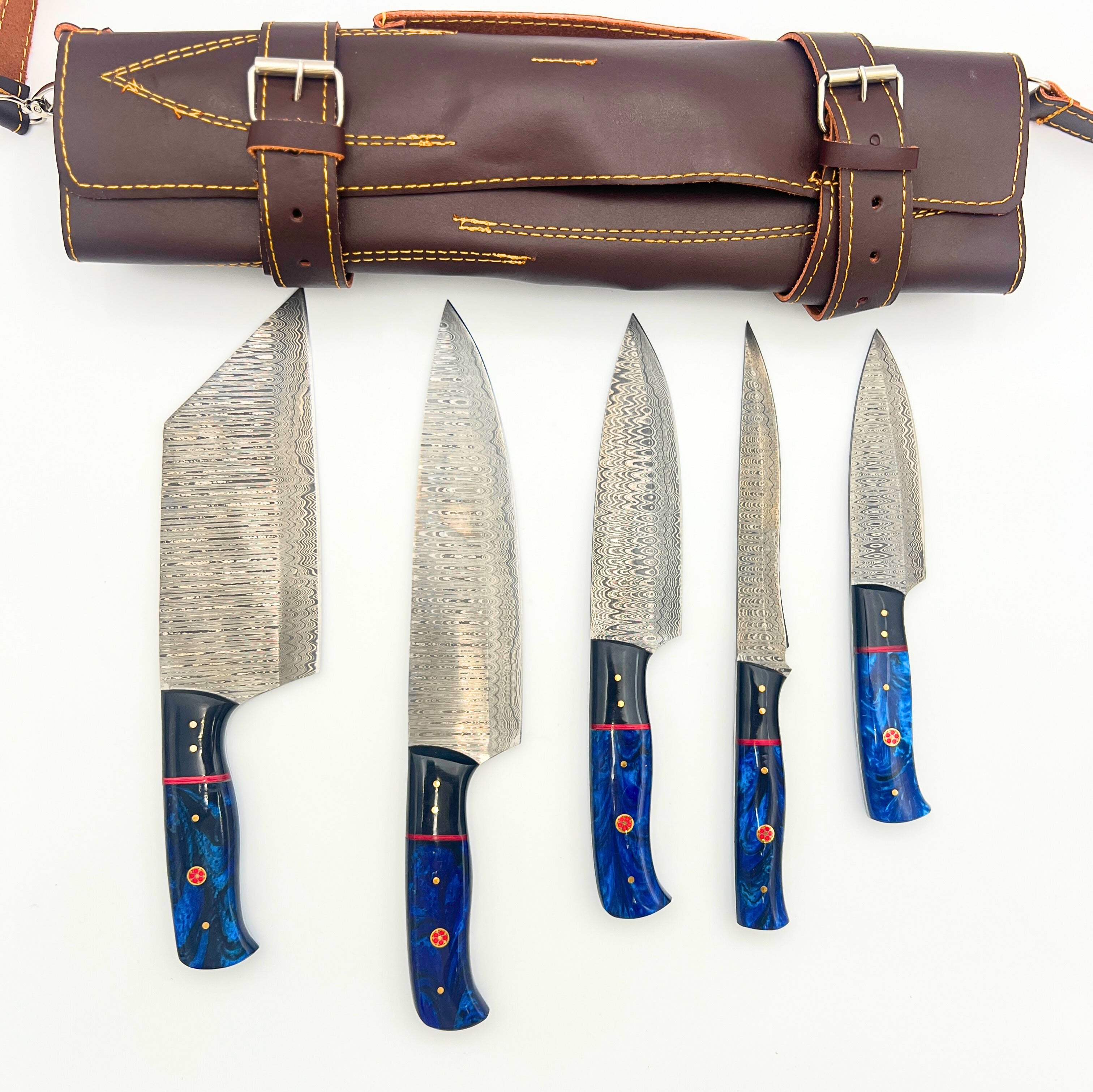 Real Damascus Steel 5-Piece Chef Knife Set with Leather Roll Blue Resin Handle