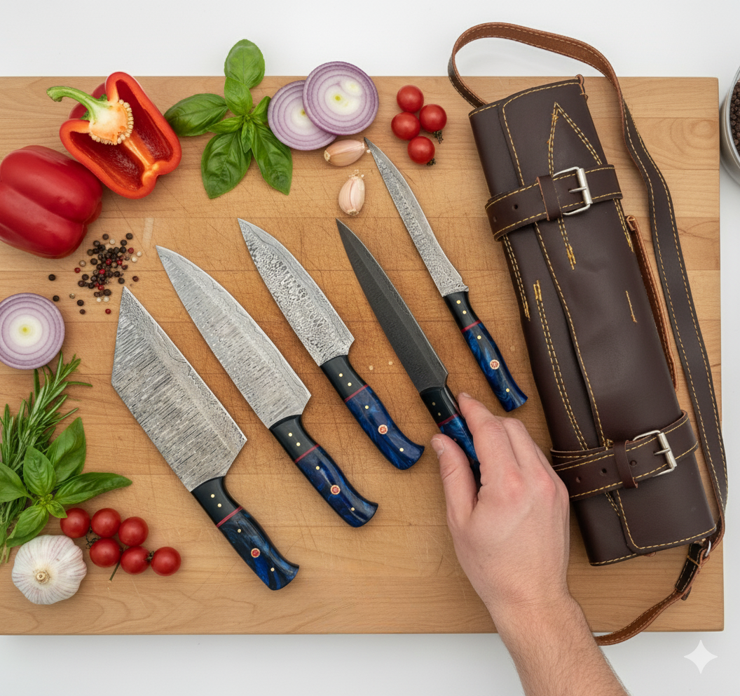 Leather Roll Case Included – Protects and organizes your knives for storage or travel.